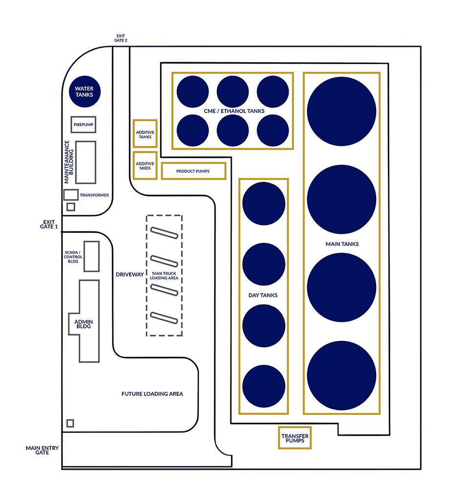 Ample space for tank farms, blending facilities and logistics infrastructure required for an international fuel hub. Allows for buffer zones for safety and environmental compliance.